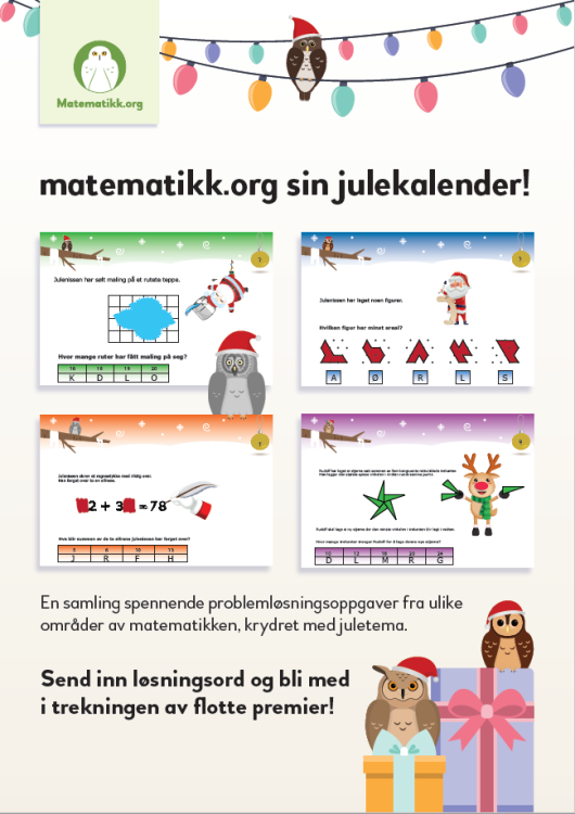 Hvis du vil ha varsel for når julekalenderen blir publisert, så send en e-post til jatakkjulekalender@matematikk.org.