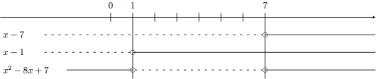 (Hvis for eksempel , er negativ, mens er positiv, dermed er produktet negativt for .) Hvis vi slår sammen fortegnene på faktorene, får vi at er lik 0 for og , positivt for og og negativt for .