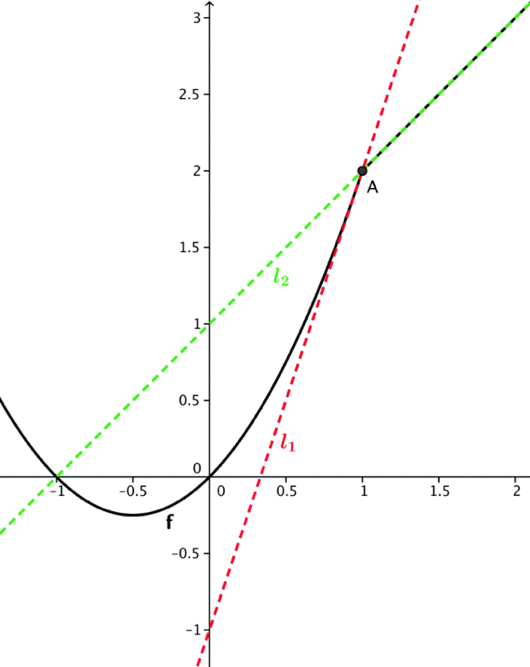 I eksempelet under ser vi en funksjon med en «knekk». Hva skjer med den deriverte i dette punktet? Vi husker at den deriverte er lik stigningstallet på tangenten til kurven. I dette tilfellet ser vi at vi får vanskeligheter med å avgjøre hva tangenten er i punktet , vi får rett og slett forskjellige tangenter avhengig av hvilken side vi kommer fra.