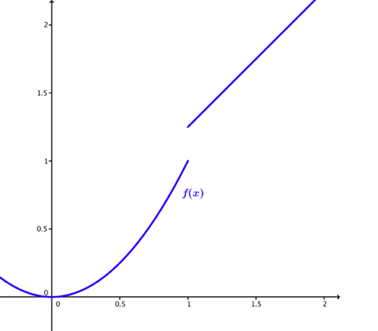 Under ser vi et eksempel på en funksjon som har et diskontinuerlig punkt; et punkt der den ikke henger sammen. Vi ser at i gjør den et hopp. Å finne stigningen i , gir ikke mening, og vi vet at ikke er deriverbar i 1.
