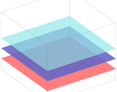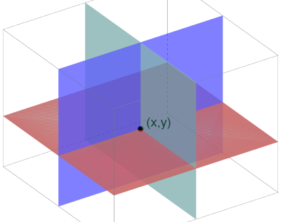 Geometrisk kan vi tenke oss et likningssett med 3 ukjente på følgende måte: Hver likning definerer et plan. Løsningen(e) finner vi der alle planene skjærer hverandre. Dette kan være aldri (ingen løsning), i en linje siden to plan skjærer hverandre i en linje (uendelig mange løsninger), eller i et punkt (én løsning).