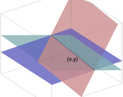 Legg merke til at likning er likning multiplisert med to pluss likning : . Dermed får vi at løsningen er og alle og som tilfredsstiller . Legg merke til at definerer en linje og det er uendelig mange løsninger.