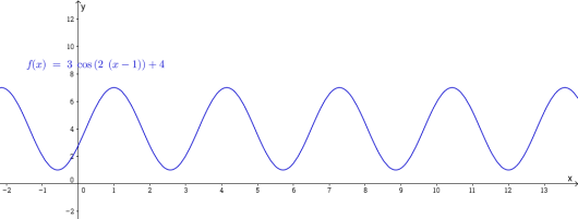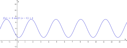 Likevektslinjen vil være linjen . Toppunktene vil ha -koordinat , mens bunnpunktene vil ha -koordinat . Avstanden fra disse til likevektslinjen er , amplituden til funksjonen. For å finne perioden bruker vi at , slik at På venstresiden står . Vi kan skrive om uttrykket på høyresiden:
