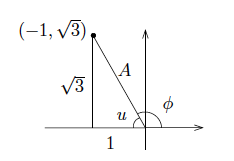 Ved å bruke setningen over, kan vi skrive venstresiden om til for en vinkel . Da er og den unike vinkelen mellom og er . Venstresiden kan skrives som , slik at likningen ser ut som Da er slik at . Symmetrien om -aksen gir i tillegg løsningen . Vi legger til alle omløp og trekker fra , slik at