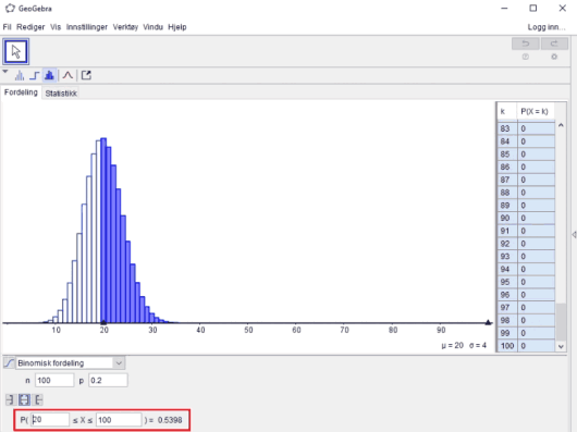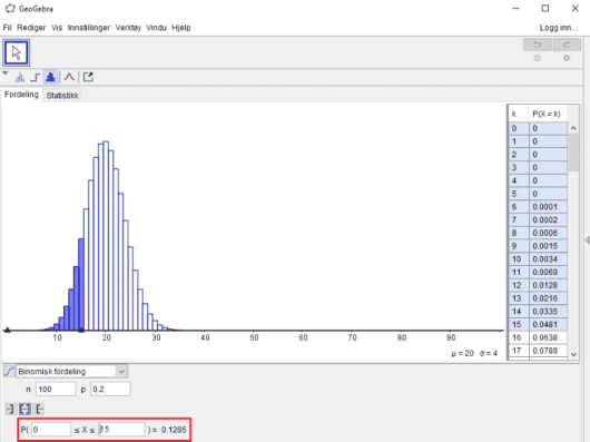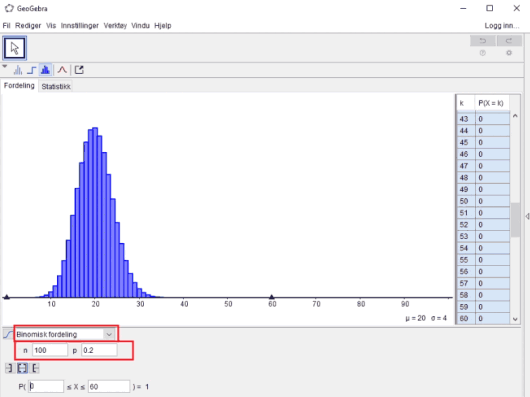 I GeoGebra kan vi også løse sannsynlighetsproblemer og visualisere fordelingene som blir brukt.