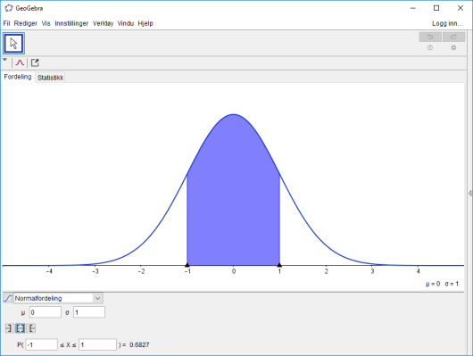 GeoGebras sannsynlighetskalkulator er veldig fin for å visualisere sannsynlighet. Vi må passe på å velge riktig sannsynlighetsfordeling, og det gjør vi ved å vite hvilken type oppgave det er vi løser. Dersom oppgaven handler om blodtrykkmålinger, høyder til mennesker og dyr, IQ og mer vil den standarde normalfordelingen passe godt.