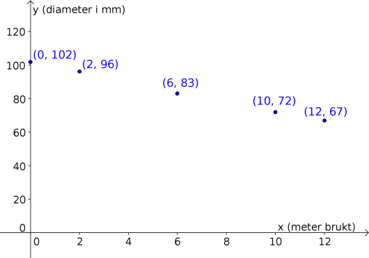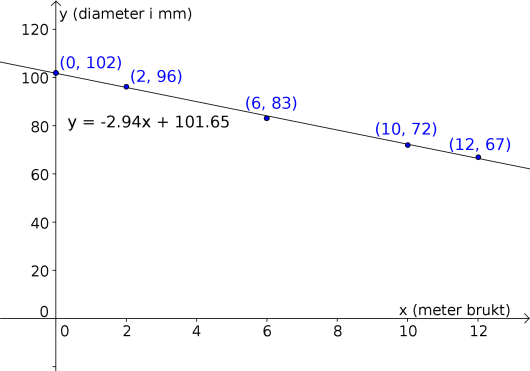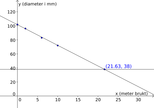 Vi ser at skjæringspunktet har koordinater . Det tolkes slik: Når vi har brukt meter dopapir, så er diameteren til dorullen millimeter, altså er dorullen tom. Det må bety at det er meter dopapir på dorullen når den er ny.