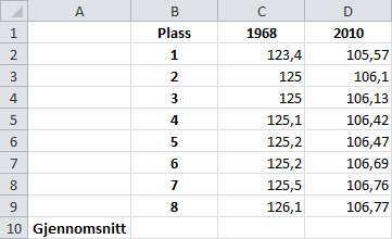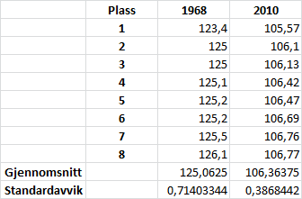 Bestem gjennomsnittstiden for de åtte beste i 1968 og for de åtte beste i 2010.