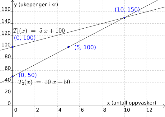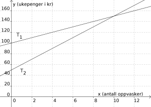 Denne oppgaven er om Der to eller flere linjer krysser hverandre, sier vi at de har et felles skjæringspunkt. I et koordinatsystem kan skjæringspunktet leses av ved å trekke en loddrett strek ned til x-aksen og en vannrett strek bort til y-aksen. Lineære funksjoner er funksjoner som er skrevet på formen . En rett linje som vanligvis kalles linje, er en rett strek som har en posisjon og retning. En linje fortsetter uendelig i begge retninger. Matematiske modeller brukes ofte for å beskrive fenomener i naturen. Matematisk modell: Betegner at man setter opp matematiske relasjoner mellom størrelser man er interessert i å analysere utviklingen av. Etter at man har laget modellen kan en benytte matematikk for å beregne hvordan fenomenet utvikler seg. Mange matematiske modeller har så kompliserte likninger at de ikke kan løses eksakt og man må da benytte numeriske metoder. Når man har funnet en matematisk løsning må svaret tolkes i forhold til fenomenet en ser på. Skjæringspunkt