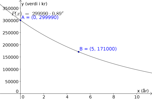 Bilen var verdt i utgangspunktet, og i følge tabellen mistet den i verdi årlig. Det betyr at etter ett år, så var bilen verdt ; etter to år var bilen verdt , og så videre. Etter år var bilen dermed verdt Hvis er bilens verdi i kroner etter år, så er altså Dette er modellen som er brukt i tabellen, og det er på formen , så modellen er lineær.
