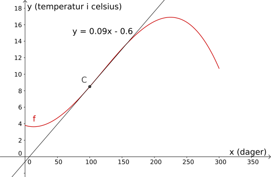 Her ser vi at tangentlinjen har likning . Det betyr at den momentane stigningen til i er . Dette forteller oss at etter dager, så vil temperaturen øke med cirka per dag.