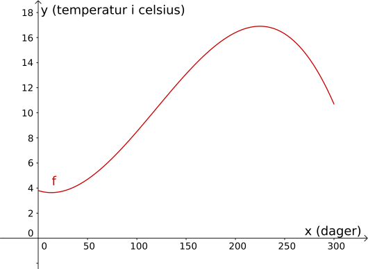 Da ser vi at bunnunktet har koordinater , og at toppunktet har koordinater . Dette betyr at etter rundt 13 dager så var temperaturen , og etter rundt 225 dager var temperaturen . Forskjellen mellom den høyeste og den laveste temperaturen er